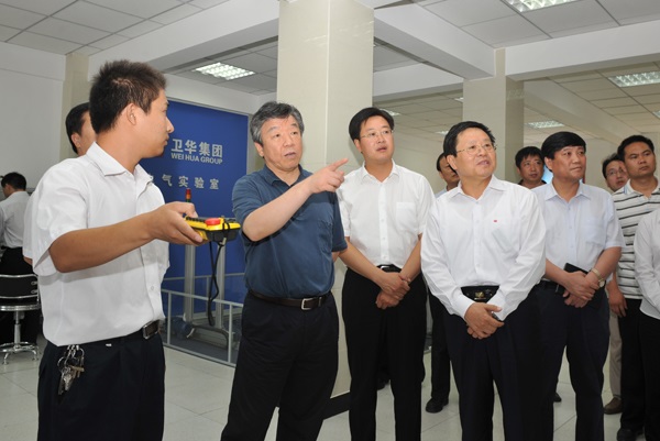 衛華集團董事長、總裁韓憲保陪同盧展工一行參觀了集團技術檢驗測試中心和和電器實驗室。在電器實驗室,盧展工饒有興趣地觀看了智能門式起重機、遠程控制系統和帶載模型演示實驗,并詳細詢問了我集團產品的技術水平、應用領域和市場情況。盧展工說,起重機最核心的是自動控制部分,你們的產品在國內具有地域優勢和價格優勢,要把握好這些有利條件,繼續加強研發,掌握核心技術,才能有持續發展的動力。