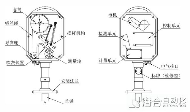 重錘式料位計的傳感器接到探測命令,減速機(jī)構(gòu)后帶動繞線筒轉(zhuǎn)動控制著系在不銹鋼鋼纜上的重錘向下降,重錘接觸介質(zhì)表面被料面托起而失重,鋼絲繩松馳,靈敏杠桿動作使 霍爾元件動作,并將位置信號傳遞給控制器,控制器得到該信號后立即發(fā)出電機(jī)反轉(zhuǎn)命令,而后重錘式料位計改變電機(jī)的轉(zhuǎn)動方向?qū)⒅劐N收回。測量過程中,重錘式料位計通過4—20mA電流信號、標(biāo)準(zhǔn)的MODBUS串行通訊方式、干接點(diǎn)三種方式傳輸給DCS系統(tǒng)或外置顯示單元料位及報警信號。