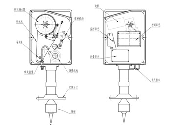 重錘式料位計(jì)的主要部件有:重錘、安裝法蘭、測量機(jī)構(gòu)、吹灰裝置、導(dǎo)向輪、鋼絲繩、鋼絲繩卷筒、擺桿機(jī)構(gòu)、控制單元、電機(jī)、測控單元、計(jì)量單元和電氣接口。